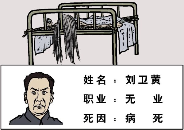 到1969年10月,刘少奇已经浑身糜烂腥臭,骨瘦如柴,气息奄奄。中央特派员既不让洗澡,也不准翻身换衣服。而是把他扒个精光,包在一床被子中用飞机从北京空运到开封,监禁在一个坚固的碉堡地下室里。在他发高烧时不但不给用药,还把医护人员全部调走,临死时,刘少奇已经没有人形,蓬乱的白发有二尺长。两天后的半夜按烈性传染病处理火化,用过的被褥枕头等遗物均被焚化一空。刘的死亡卡片上这样写着:姓名:刘卫黄;职业:无业;死因:病死。